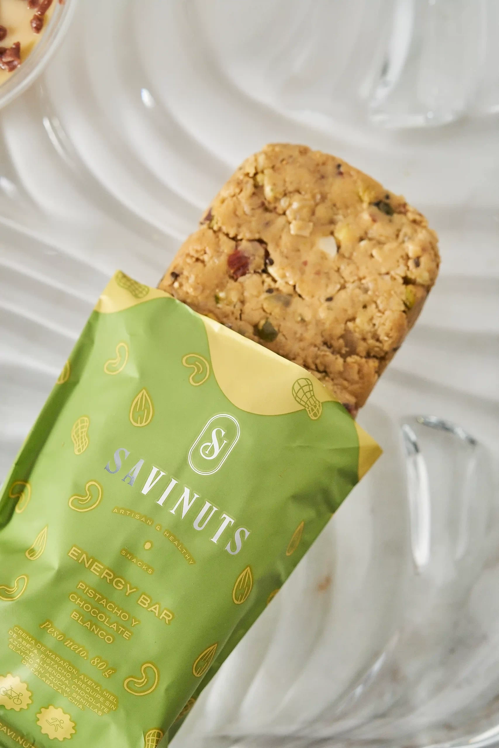 Barrita nutritiva de crema de marañon, con pistachos y trozos de chocolate blanco. Adquiere 1 barrita o tu caja de 12 unidades.